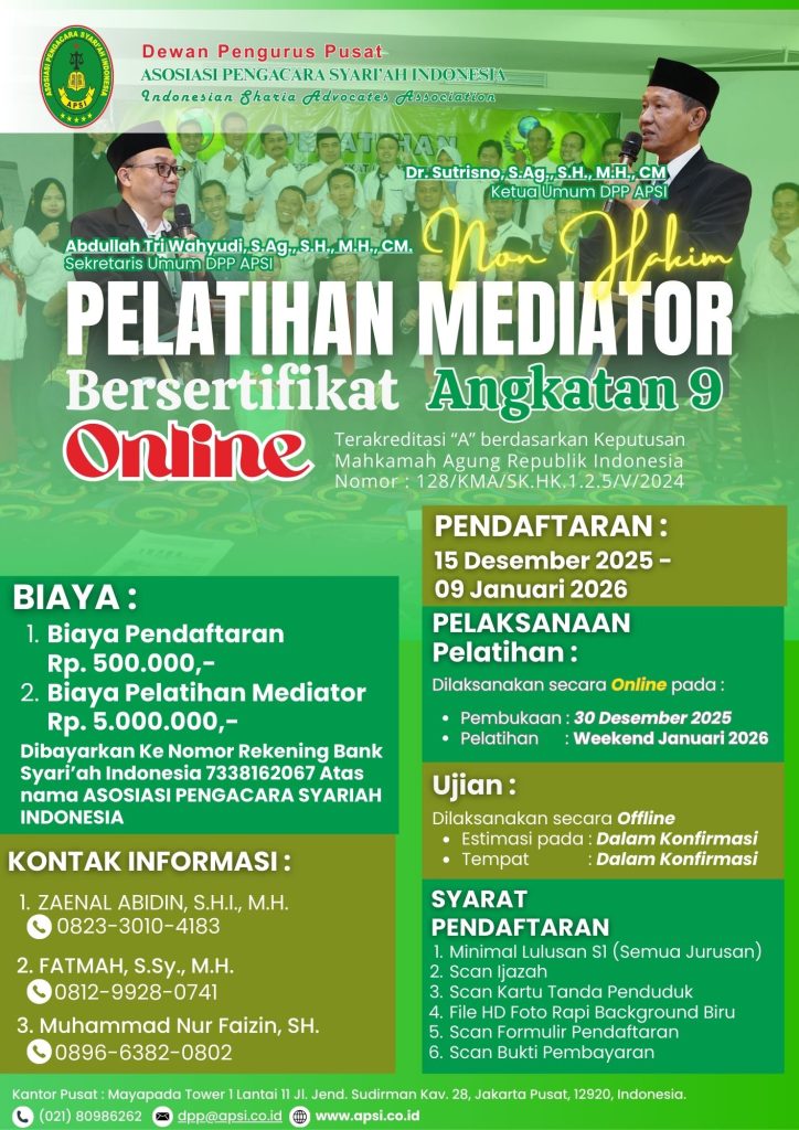 Asosiasi Pengacara Syari’ah Indonesia (APSI) membuka Pendaftaran Pelatihan Mediator Non Hakim Bersertifikat Angkatan 9 yang diselenggarakan secara online dan telah Terakreditasi “A” oleh Mahkamah Agung Republik […]
