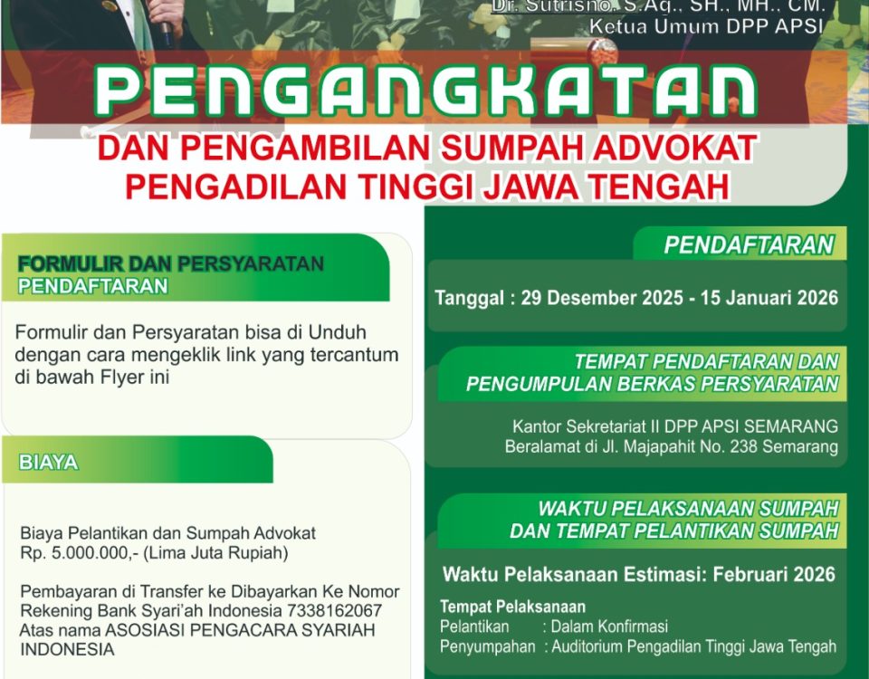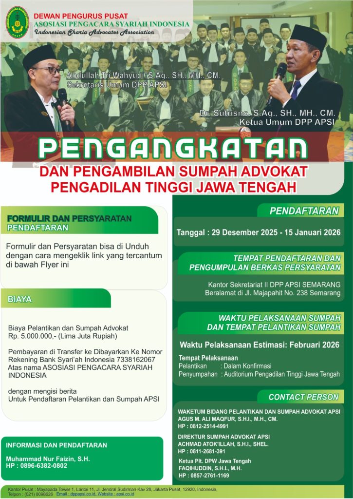 Dewan Pengurus Pusat Asosiasi Pengacara Syariah Indonesia (APSI) membuka pendaftaran Pengangkatan dan Pengambilan Sumpah Advokat yang akan dilaksanakan di Pengadilan Tinggi Jawa Tengah. Kegiatan ini merupakan […]
